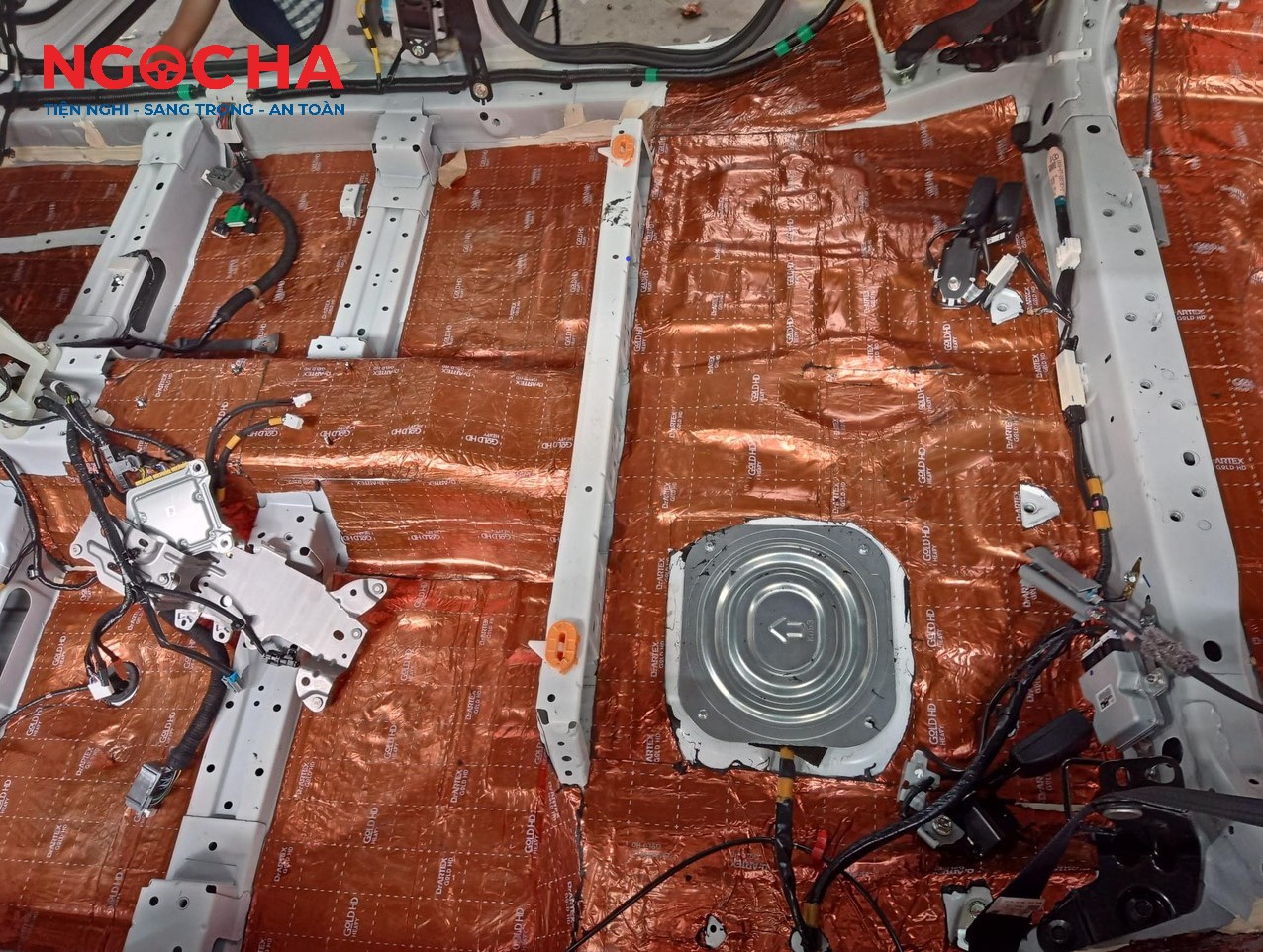 - Cách âm sàn xe & hốc lốp: Sàn xe và hốc lốp là nơi mà tiếng ồn từ lốp xe đội vào trong xe nhiều nhất. Khi thực hiện cách âm ở vị trí này sẽ triệt tiêu phần lớn tiếng ồn từ 4 lốp xe. Nhất là đối với các dòng xe 7 Chỗ như santafe, Xpander, Innova... Do vị trí hốc lốp nằm trong khoang xe. Gây tiếng ồn rất lớn
