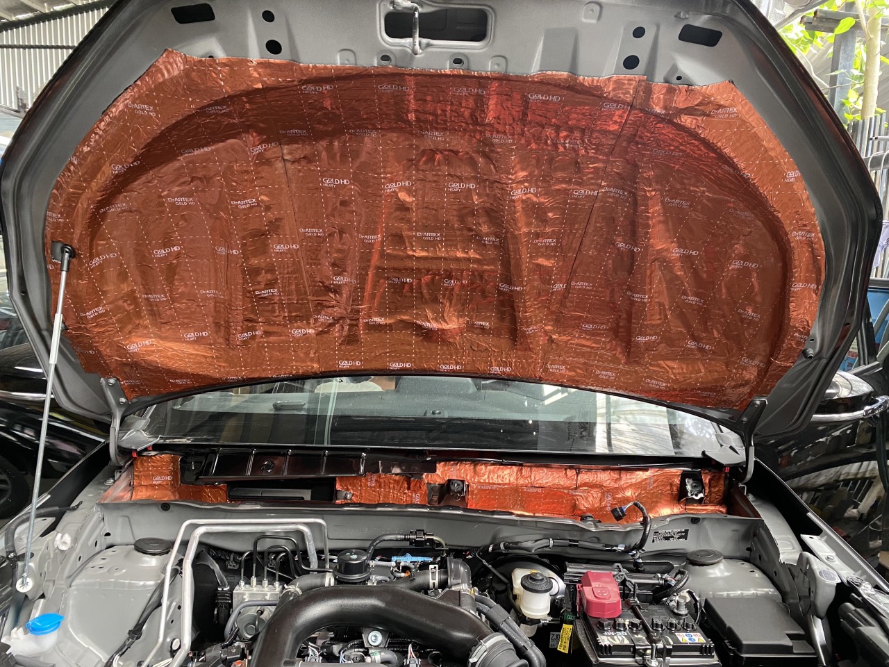 - Cách âm khoang động cơ (nắp capo và chân kính): Tiếng ồn của động cơ dội lên nắp capo và đi vào phần kính lái, và chân kính lái.Thực hiện cách âm ở 2 vị trí này giúp giảm tương đối tiếng ồn từ động cơ vào trong xe.