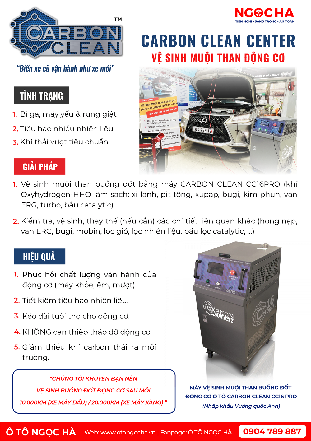 Ô Tô Ngọc Hà trang bị máy Carbon Clean CC16 Pro được nhập khẩu nguyên chiếc từ Vương Quốc Anh, là chiếc máy tốt nhất hiện nay trong việc vệ sinh buồng đốt động cơ ô tô.